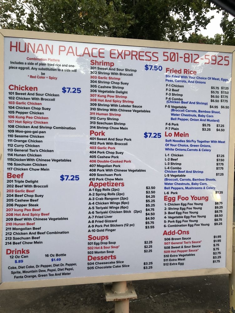 Introducing the menu at Hunan Palace Express, a delightful gem located in North Little Rock, AR. This small, family-run Chinese eatery specializes in authentic dishes that prioritize both quality and value. Their menu features a flavorful array of appetizers like the crispy Egg Rolls ($2.15) and savory Spring Rolls ($1.45), perfect for kicking off your meal.